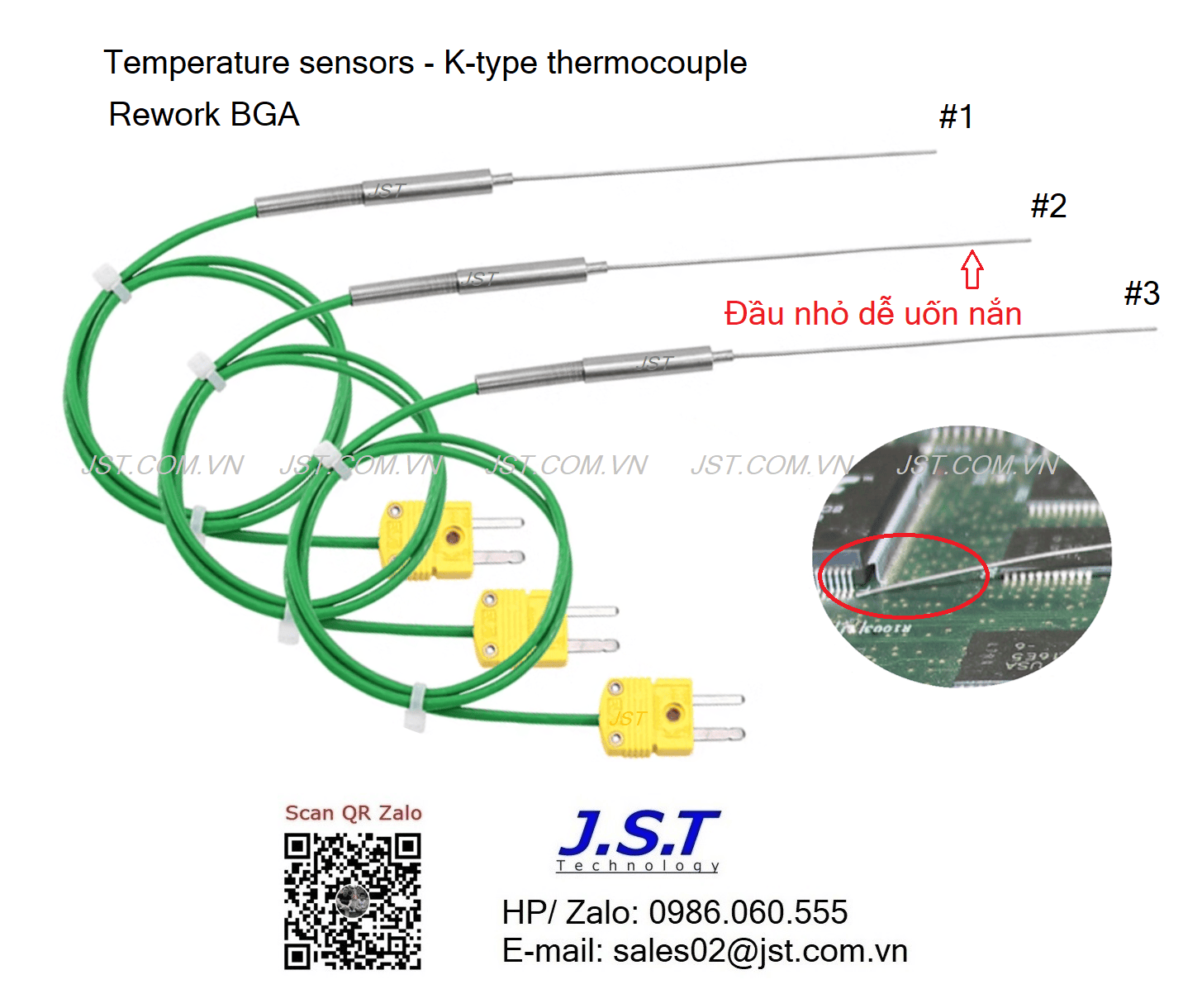 Temperature sensors - K‐type thermocouple Rework BGA: Cảm biến nhiệt độ loại K dải nhiệt 0~1100oC dùng cho máy sửa BGA hoặc hotplate, ưu điểm đầu cảm biến nhỏ dễ uốn nắn vị trí chân linh kiện nơi cần đo nhiệt độ chính xác hơn. đủ các loại kích thước: