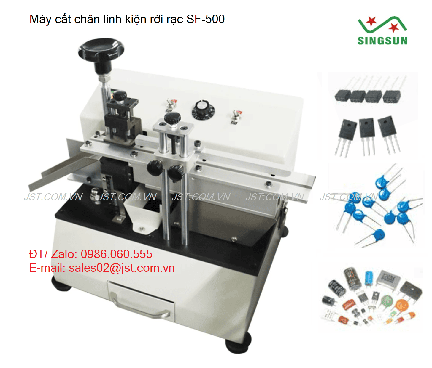 - Electronic Components Lead Cutting Machine SF-500 (Máy cắt chân linh kiện điện tử: tụ điện, IC, Transistor,..) ưu điểm: Máy cắt chân chi tiết rời rạc, cấp liệu phẳng, phù hợp với các liện điện tử lớn và nhỏ, có thể lắp gắn với Part Feeder, phương pháp cắt đặc biệt, dao cắt SKD11 tuổi thọ dài, dễ điều chỉnh, vận hành đơn giản và bảo trì dễ dàng.