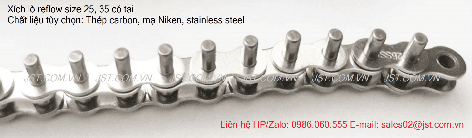 Xích lò reflow size 25, 35 có tai, chất liệu: Thép Carbon, mạ Niken, stainless steel. Xích lò reflow theo yêu cầu đặc biệt từ khách hàng.