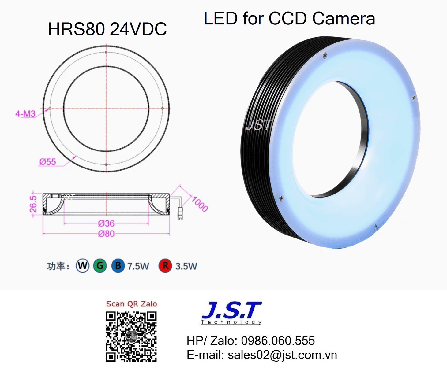 LED for CCD Camera JST-HRS80-W 24VDC đường kính ngoài phi 80mm, điện áp 24VDC, công suất ánh sáng trắng 7.5W sử dụng cho camera công nghiệp, LED có độ sáng đồng đều, không còn độ bóng, loại bỏ các khuyết tật phản chiếu, giúp Camera phát hiện rõ nét các chi tiết trên sản phẩm.