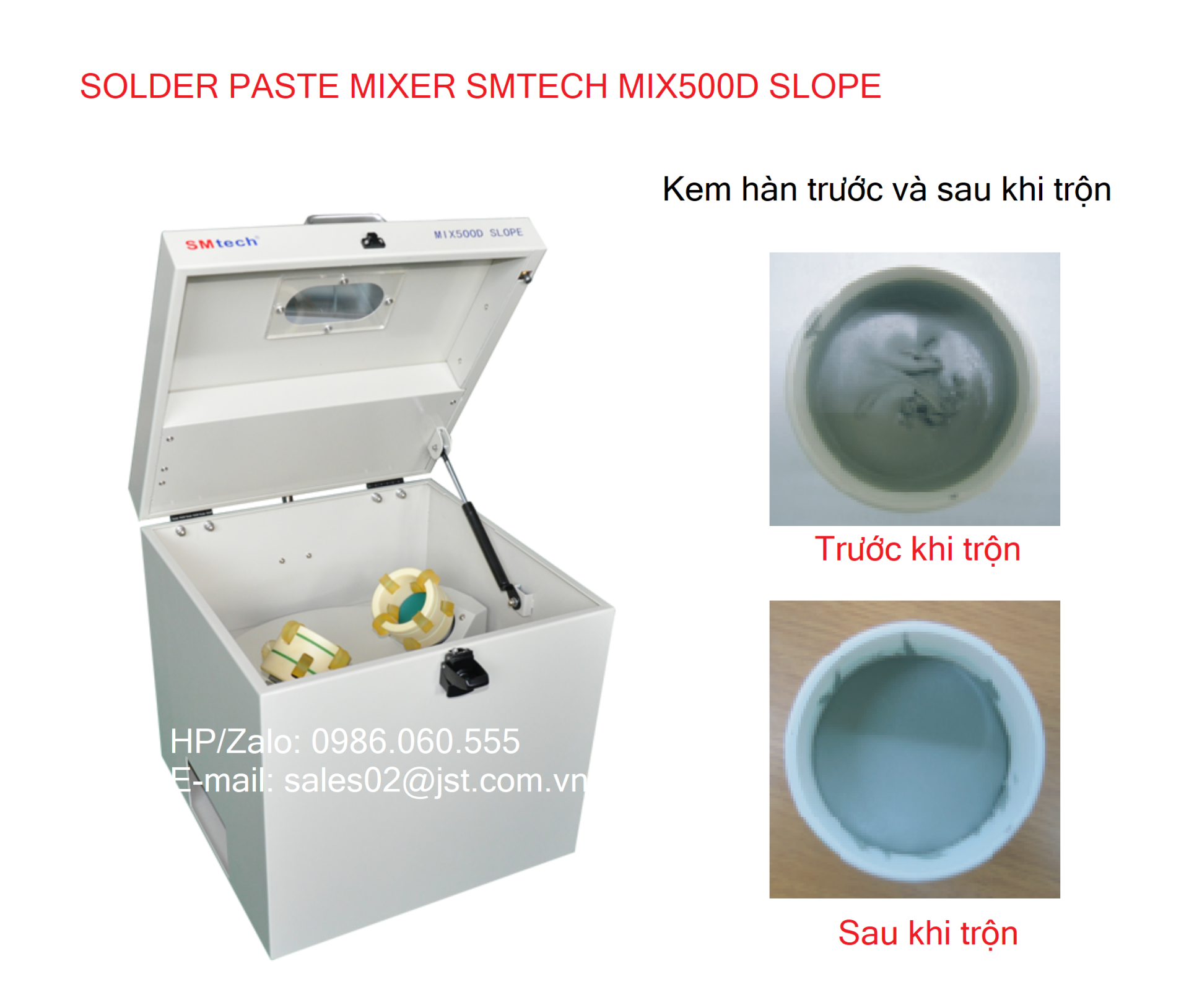 Máy trộn kem hàn tự động SMTech MIX500D là một sản phẩm phụ trợ rất đáng đầu tư cho dây truyền sản xuất SMT (SMD), theo đánh giá từ các khách hàng Nhật thì máy hoạt động tốt, rất ổn định, độ ồn thấp, ngoại quan đẹp, chắc chắn, trộn đều và hiệu quả kem hàn thành dạng lỏng. Nó giúp đạt được kết quả tốt hơn trong quá trình in khuôn và hàn chảy. Việc sử dụng máy trộn cũng làm giảm khả năng hấp thụ độ ẩm trong không khí vì không cần phải mở nắp lọ kem hàn trước khi sử dụng trong sản xuất.